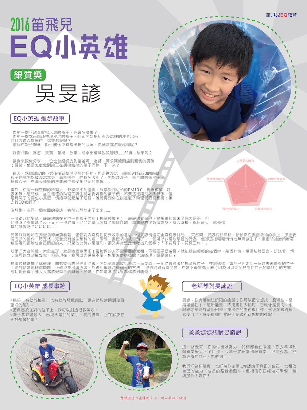 這一路走來,你的付出及努力,我們都看在眼裡。你去年得到銅質獎後立下了目標:今年一定要拿到銀質獎,很開心為了成為更棒的自己,你做到了!